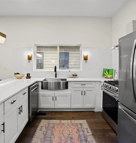 - Modern kitchen with dolomite countertops, shaker cabinets, and stainless appliances